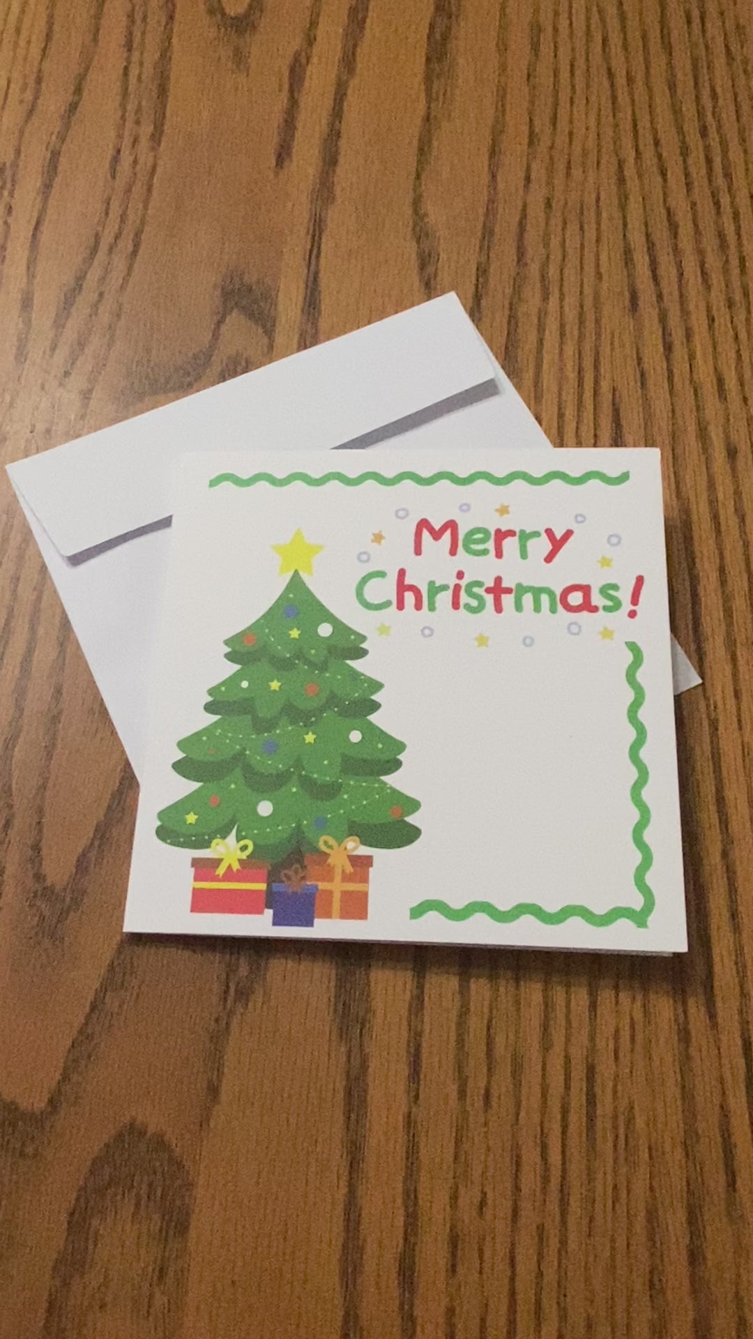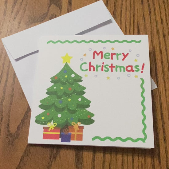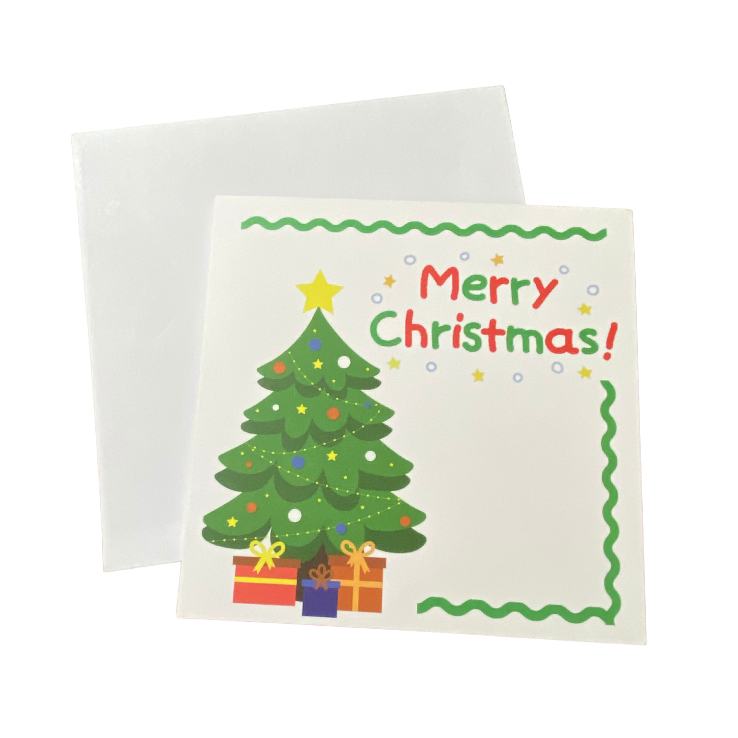 Christmas greeting card with Christmas tree and Santa with his sleigh, envelope included