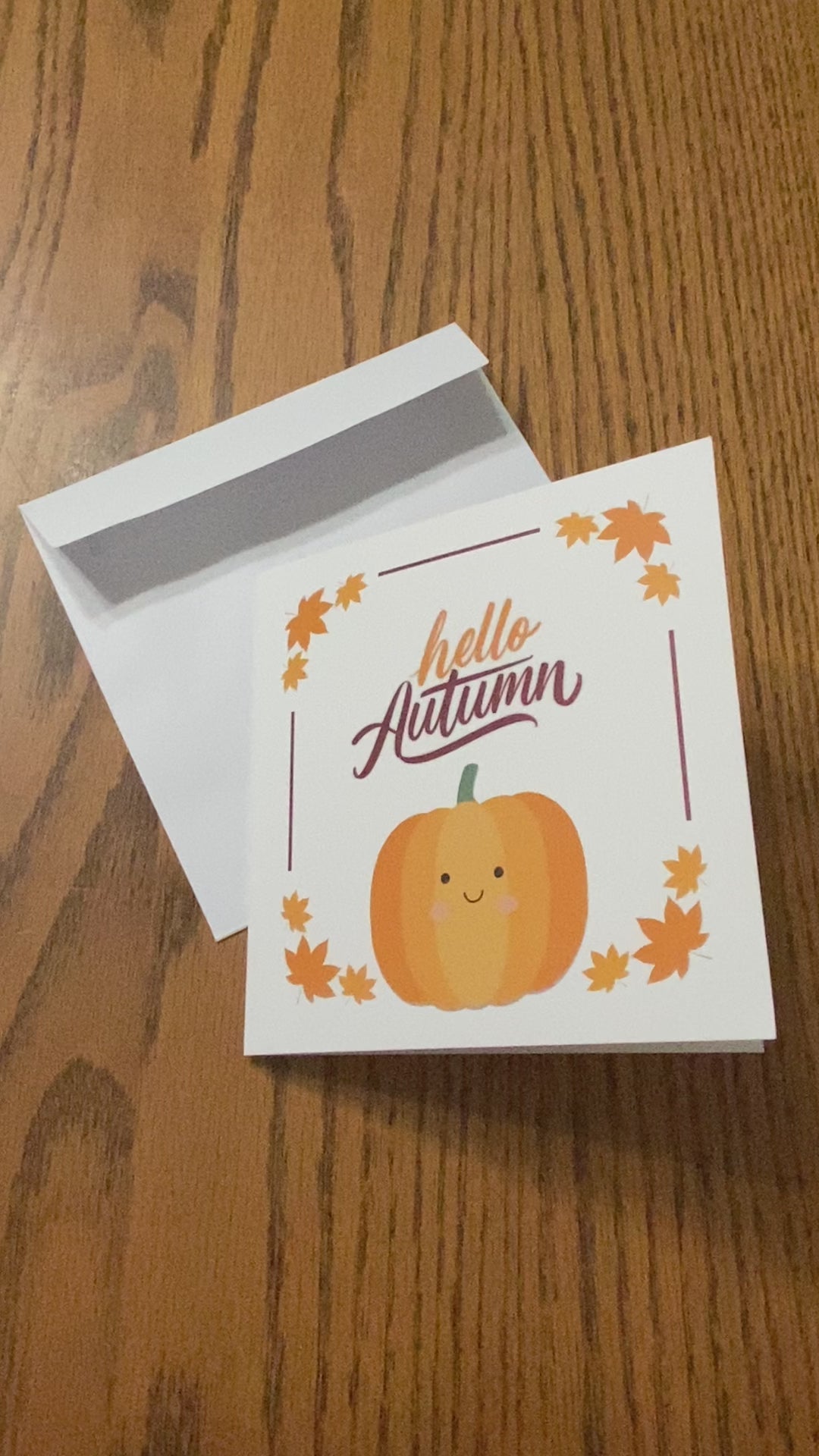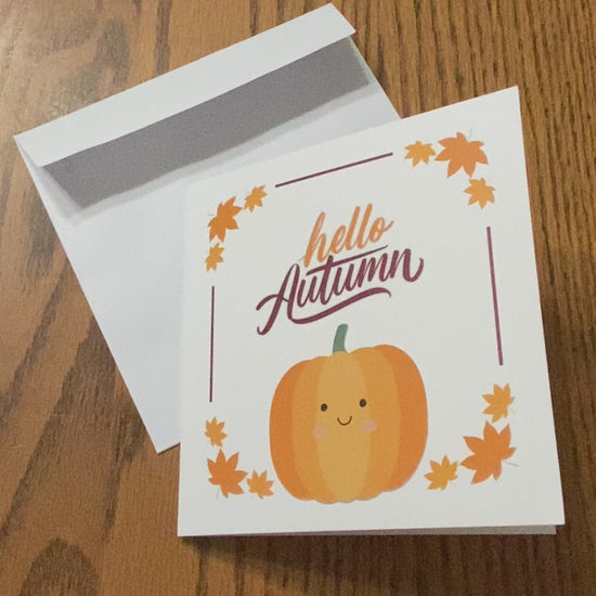 Celebrate the cozy feelings of fall with this Hello Autumn greeting card, with an adorable pumpkin and vibrant fall details. Comes with a matching envelope, making it easy to share a playful seasonal message with friends and family. Perfect for spreading cozy cheer!